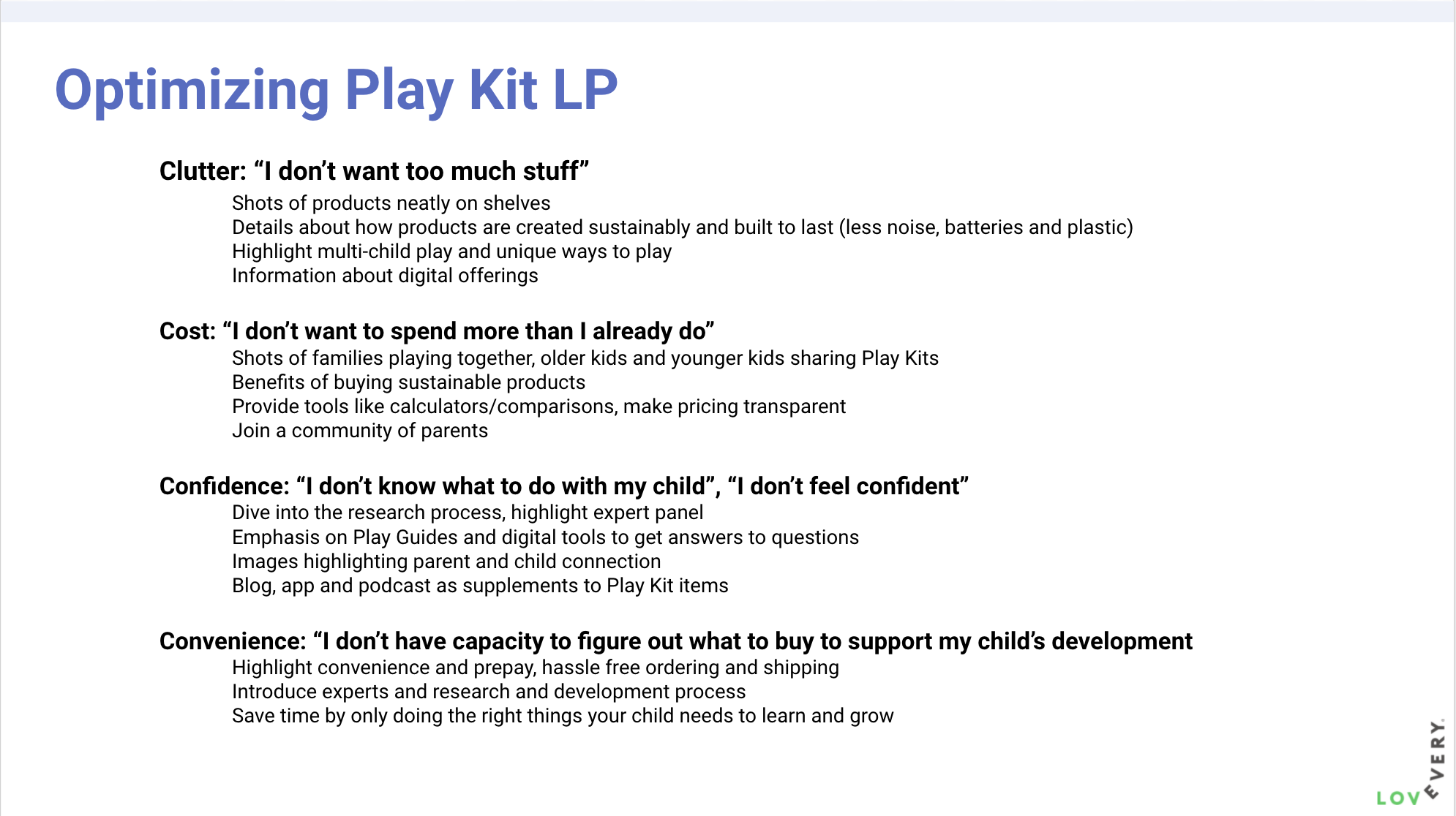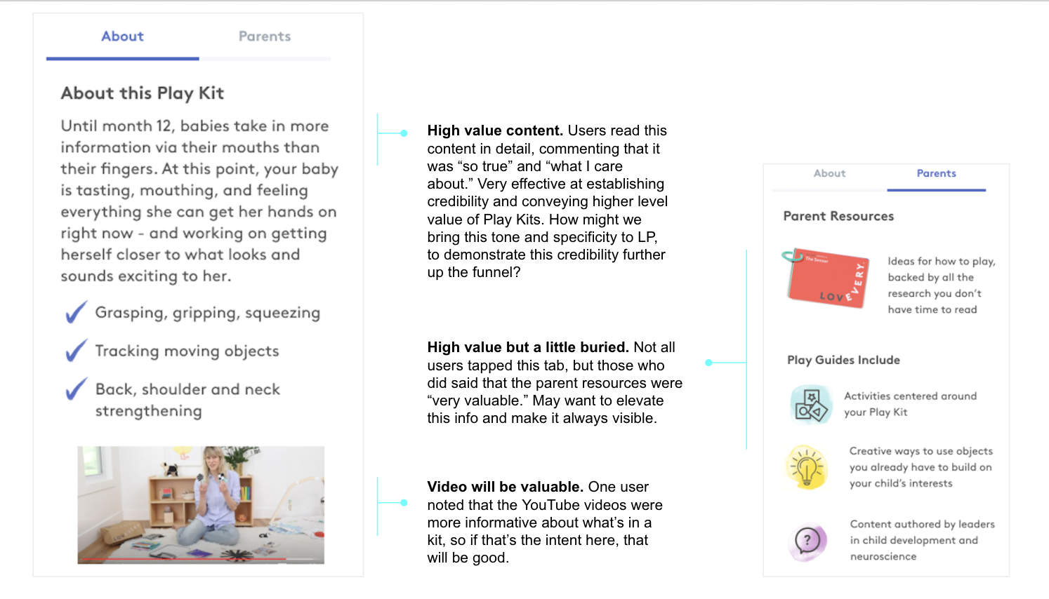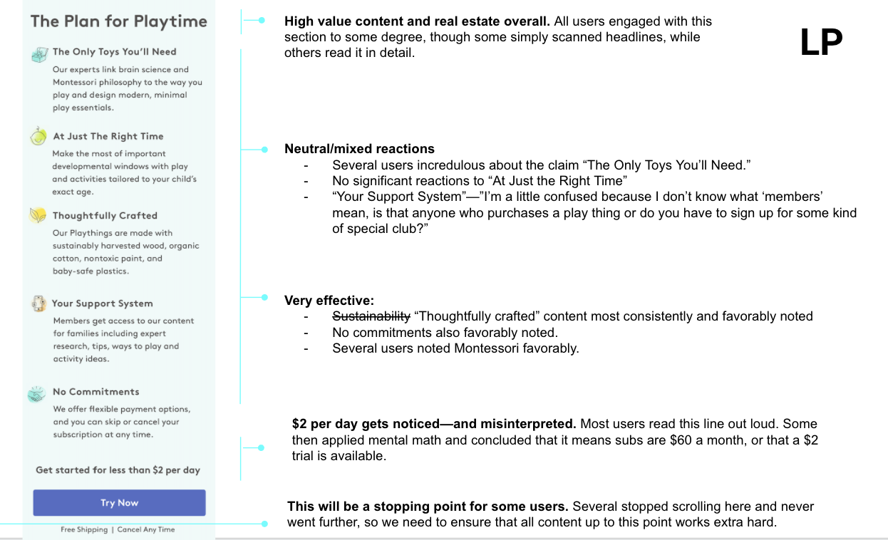 A lot of objections to cost—we’re not nailing the perception of value. Participants looked at the kit contents—and specifically the number of toys—to gauge value. Some did mental math to add up their own estimates based on standard toy prices. Need to address this objection more head-on. Participants who engaged with developmental content, and the existence of the Play Guide, spoke about kits more holistically as a tool to support their parenting. Elevating this messaging to the LP and strengthening the sense of “wholeness” of each kit on the PDP would likely increase perceptions of value.
