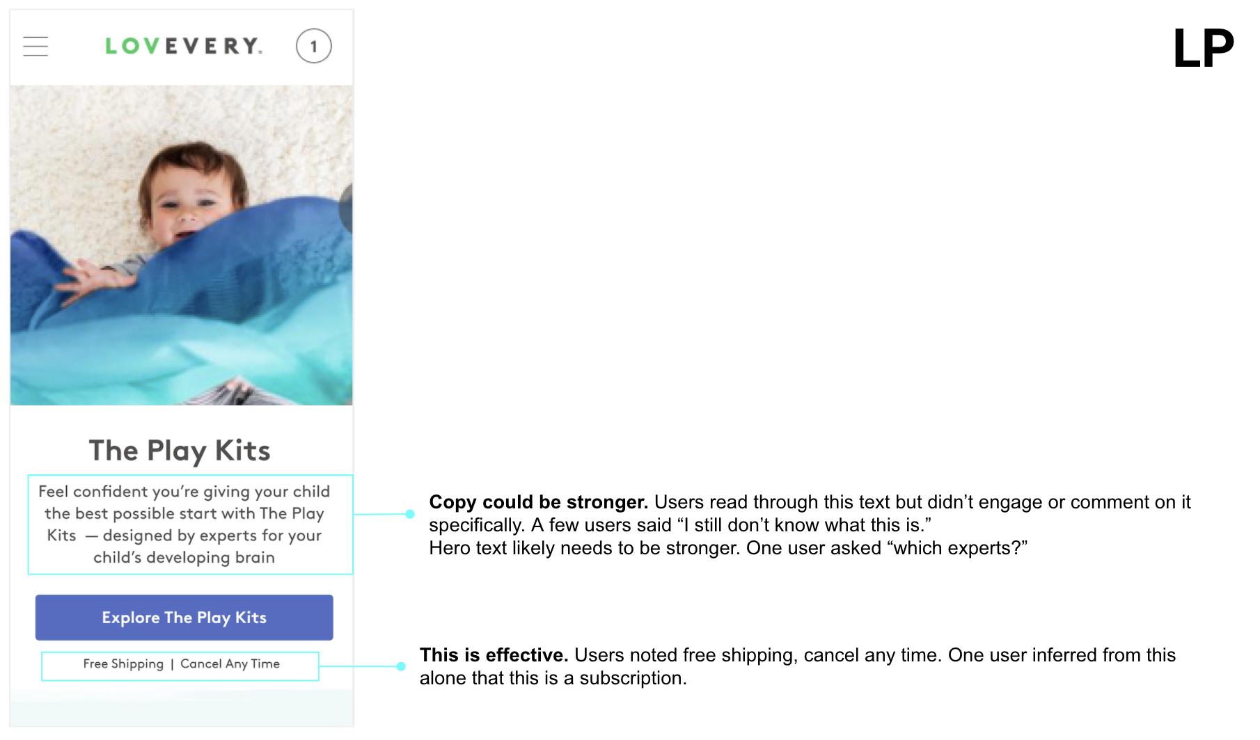 LP and PDP successfully convey the basic product concept. All participants formed the accurate impression that play kits are subscription service of developmentally-targeted toys.