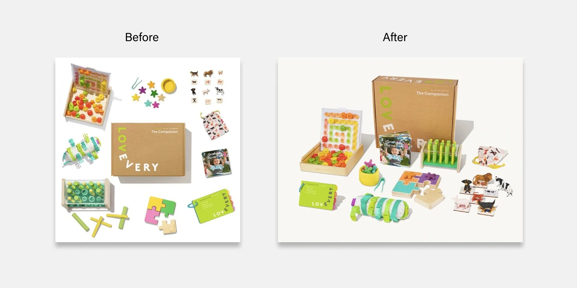 Lovevery Play Kits stand out in the market due to their exceptional quality and craftsmanship. Our research and analytics revealed that users enjoy thoroughly examining each toy before committing to a subscription. However, our current flatlay image, while playful in line with our brand, lacked the interactivity and merchandising effectiveness we desired. Collaborating with the visual design and creative team, we explored ways to meet industry standards. By drawing inspiration from competing products and incorporating mood boards, we successfully showcased the beauty of our products while emphasizing their cohesive nature.