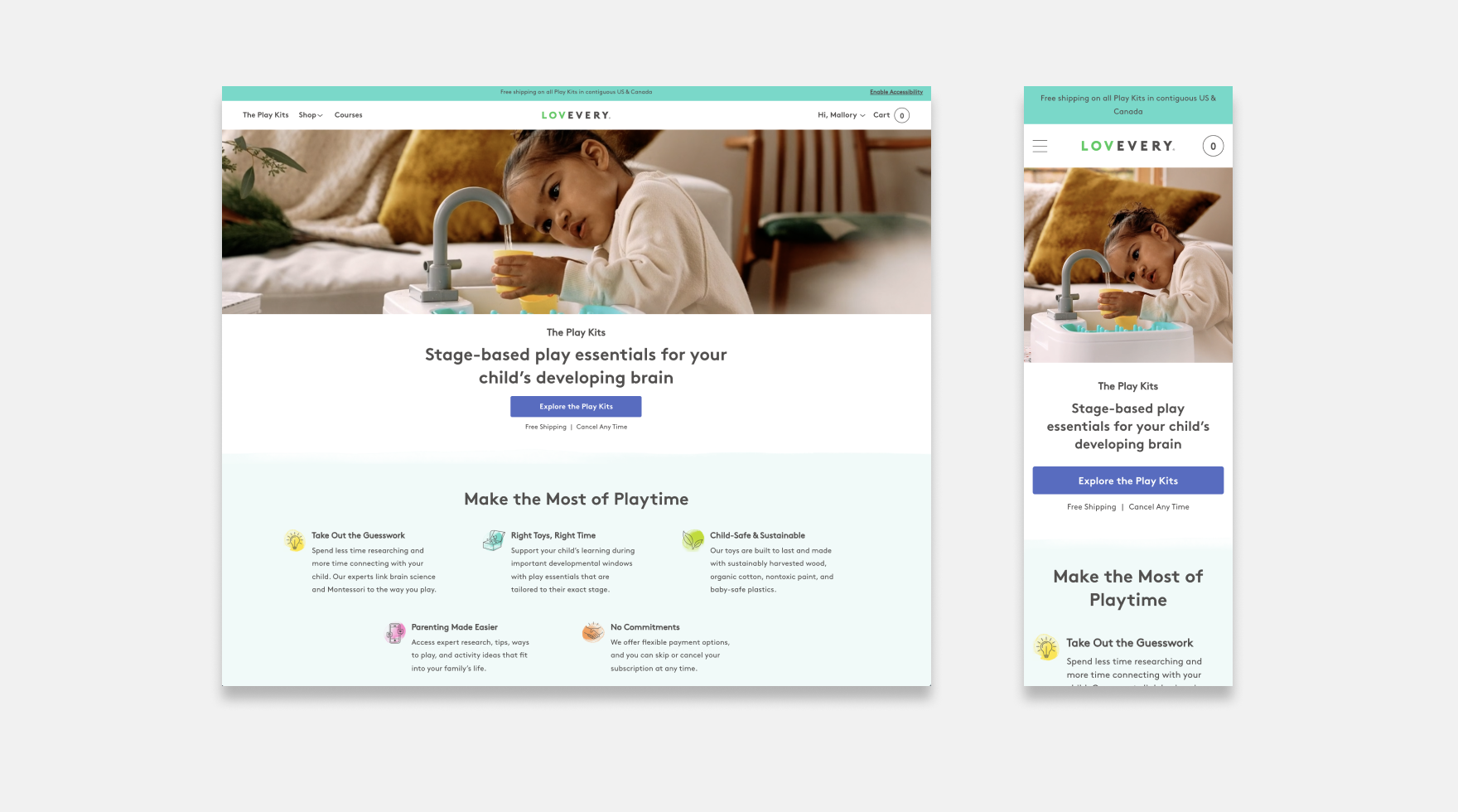 I partnered with our growth team to understand which winning ad copy we can repurpose to describe our Play Kits. For our early prototypes we played around with headlines like “Make the Most of Playtime”, “More than a box of toys” and “The Right Toys at the Right time”.